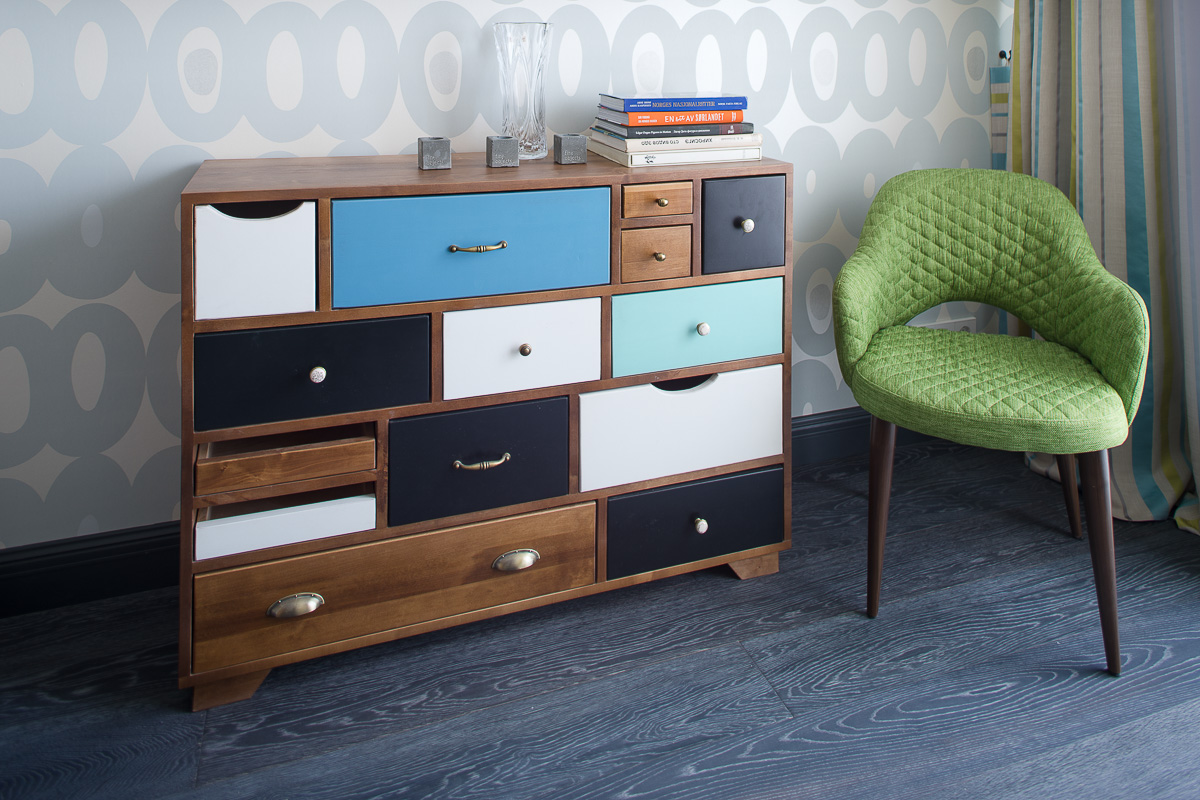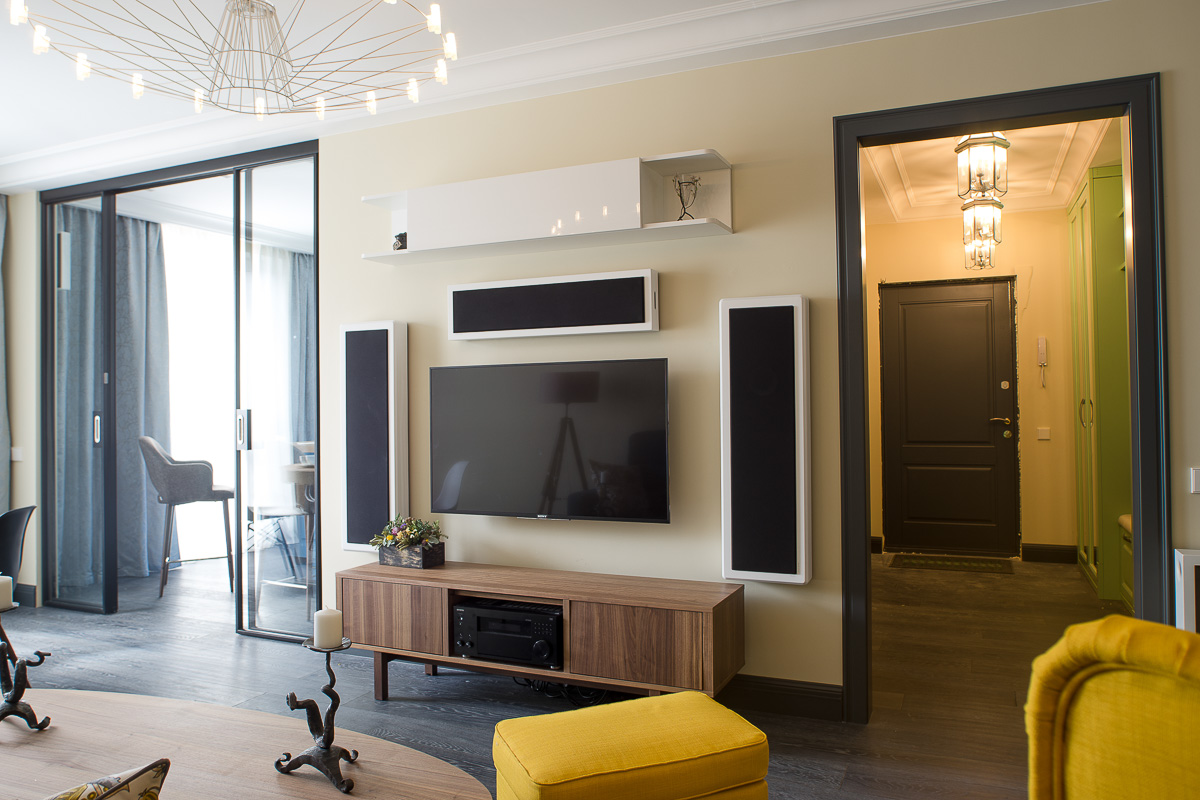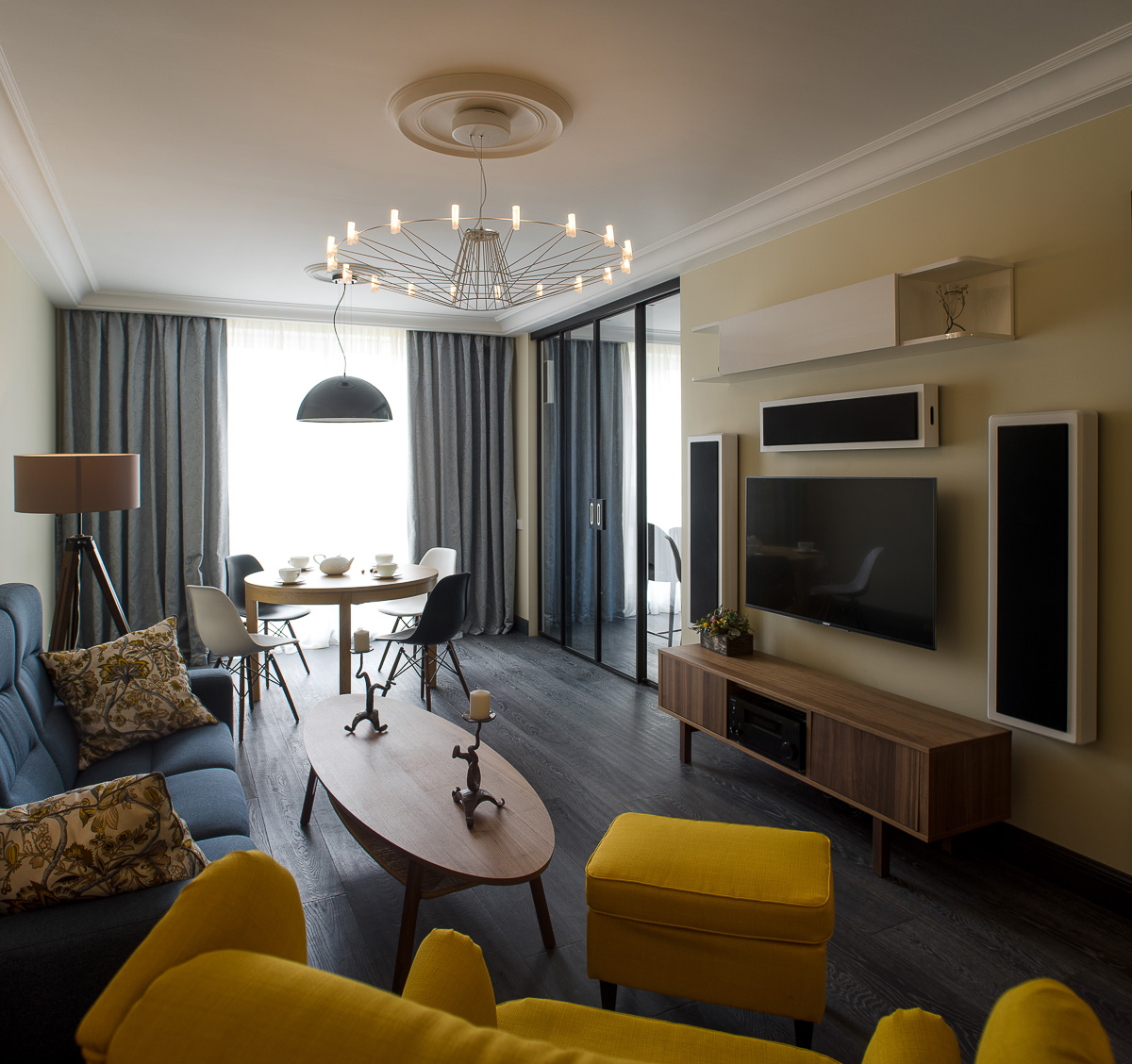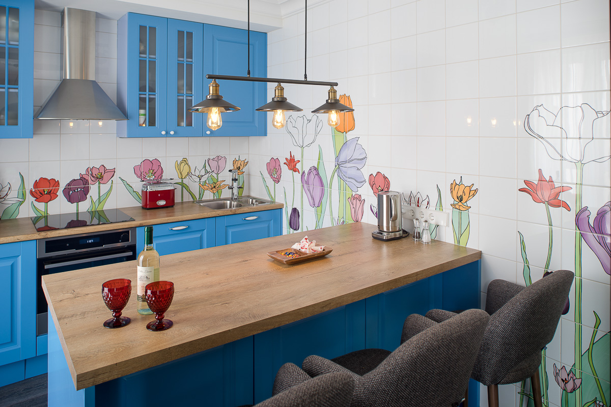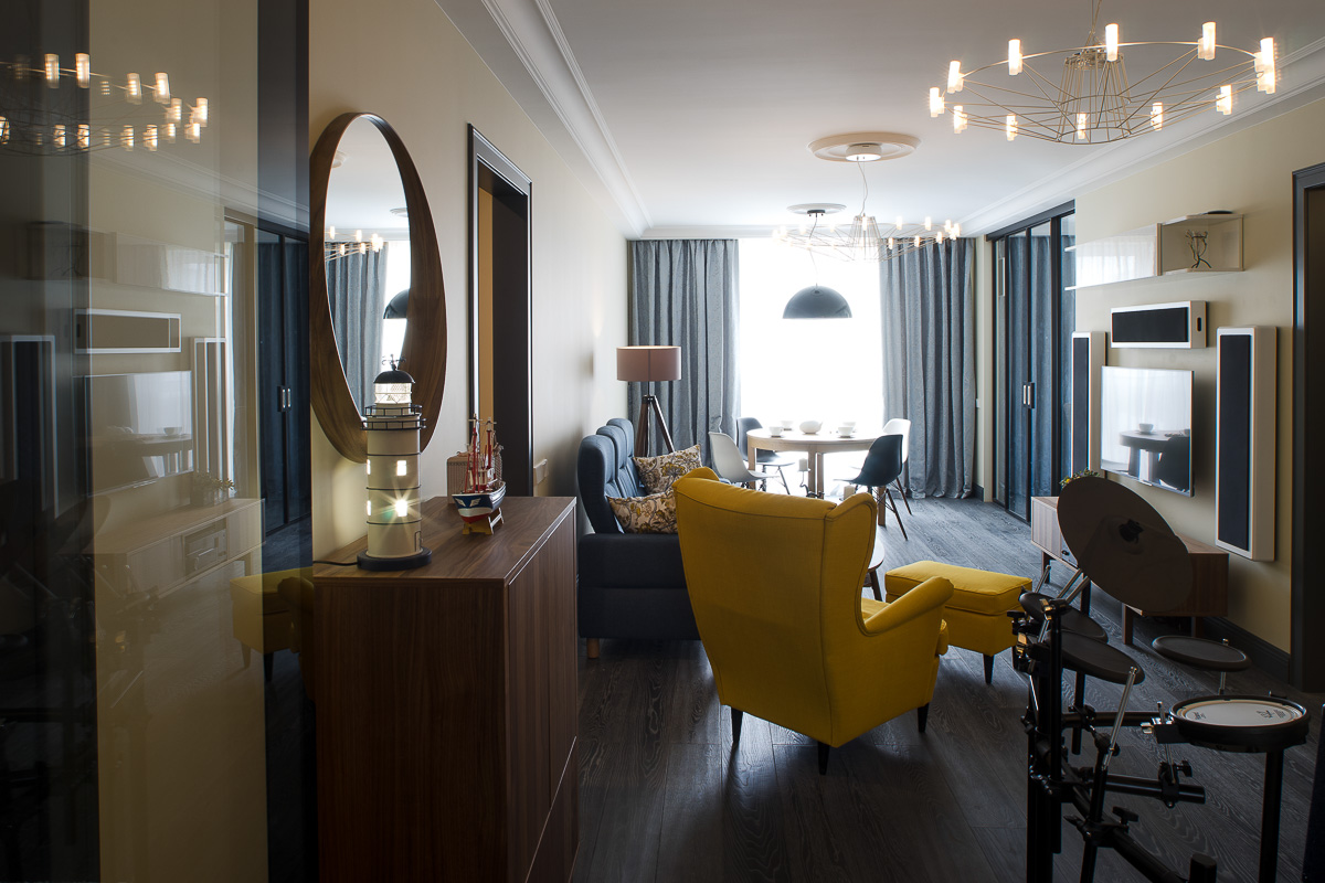 Проект квартиры в ЖК "Царская столица" был разработан архитектурной студией INSCALE с учетом вкусов и предпочтений творческих заказчиков, увлекающихся музыкой. По техническому заданию от заказчиков в квартире нужно было выделить кабинет, две спальни, зону гостиной, в которой необходимо было разместить обеденный стол, пианино и барабанную установку, а также организовать в кухне остров с полубарной стойкой. По материалам клиенты отдавали предпочтение текстурам дерева, серо-синей цветовой гамме и растительным орнаментам в дизайне интерьера. Часть кухни выложена плиткой коллекция VAN DER HILST от фабрики Bardelli, дизайн которой разработал голландский художник и ландшафтный архитектор Роналд ван дер Хелст.