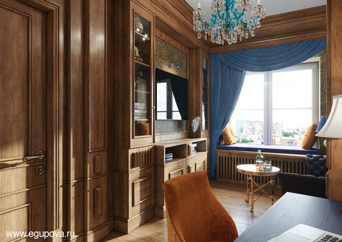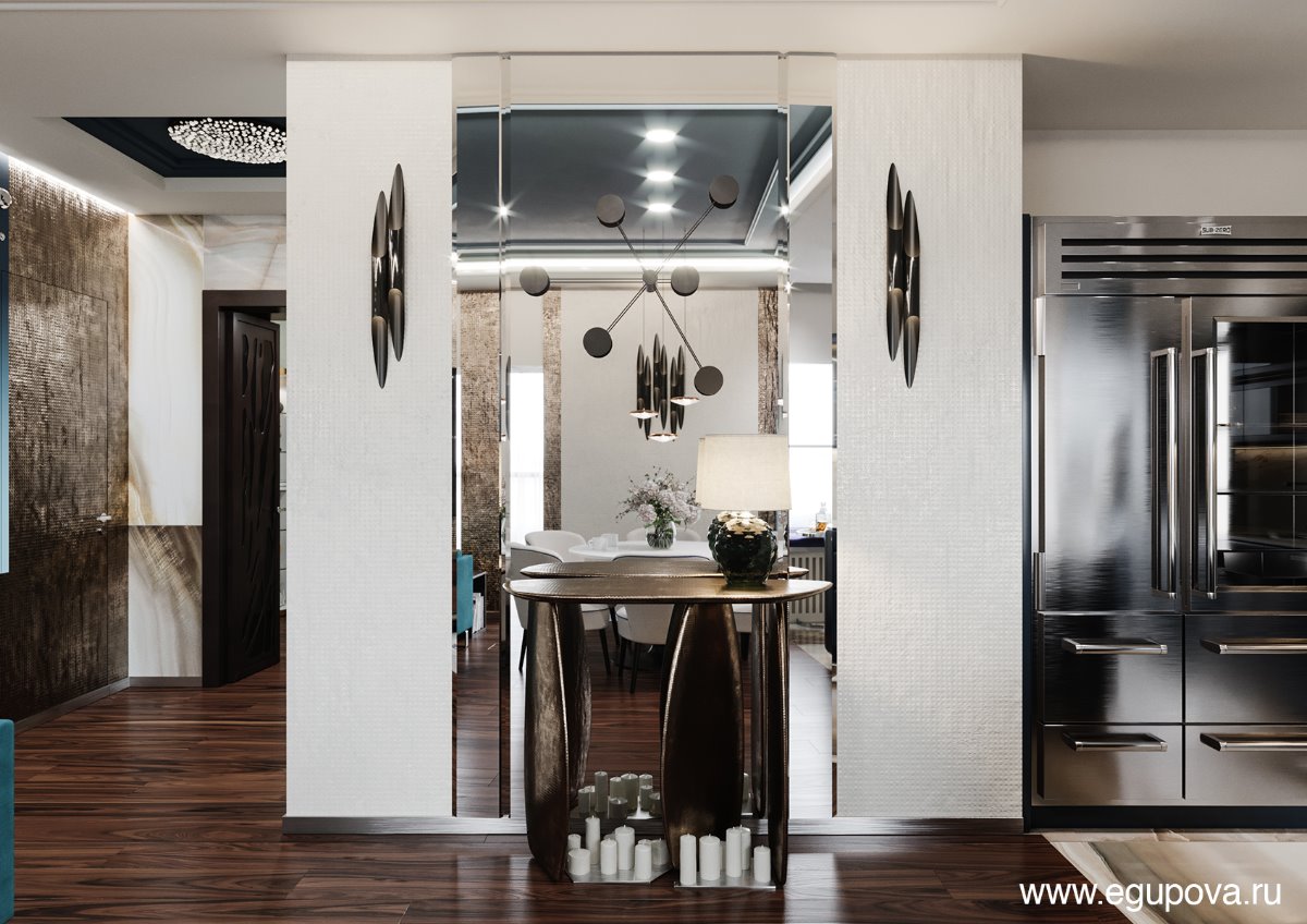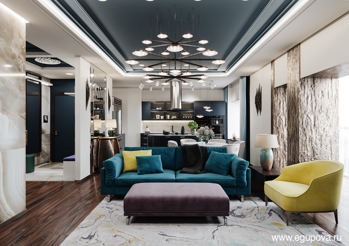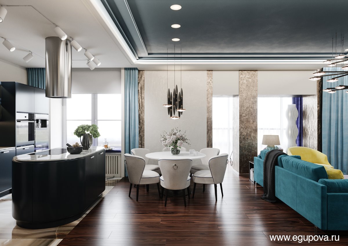 Самым актуальным трендом в интерьере сегодня является уникальность и индивидуальность. Люди часто путешествуют, и им нравится многое: ар-деко и шеби-шик, кантри и то, что не определено стилистически. И они не готовы делать выбор в пользу чего-то одного. Таким было техническое задание к проекту квартиры в ЖК "Империал". Здесь зона прихожей, кухни, столовой, гостиной объединены: тема ар-деко с яркими акцентами любимого заказчицей синего цвета. Темно-синяя кухня от немецкой фабрики давно полюбилась хозяйке дома и должна была вместе с островом непременно украсить этот интерьер. В поддержку кухне сделан потолок необычного для глаз, но такого актуального в современных интерьерах темно-синего цвета. Остальные помещения этой квартиры выполнены в разных стилях. Интерьер получился респектабельным и оригинальным.