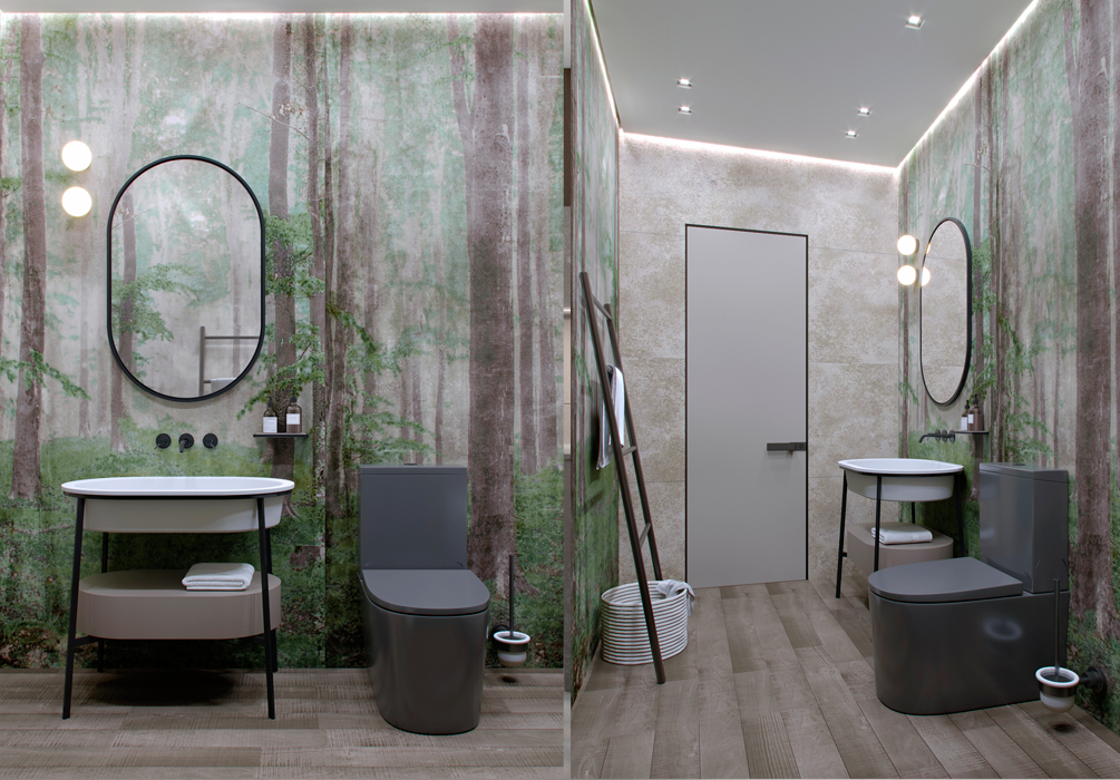 Крупноформатный керамогранит помог воплотить дизайнерское видение Екатерины Пихтиной. Особенно хочется отметить дизайн ванной комнаты: на стене крупноформатный керамогранит, мастерски имитирующий фотообои, на которых изображен лес. Коллекция Wide&Style от фабрики ABK включает в себя широкую гамму декоров, позволяя создать эксклюзивный и уникальный дизайн! ⠀ В этой же ванной комнате привлекает внимание раковина из коллекции Catino от фабрики Cielo. Умывальники Catino фабрики Cielo награждены престижной премией в области дизайна Red Dot 2017. Catino: круг и овал, два различных варианта одного и того же умывальника, очень гармонично размещаются на стальной раме в матовом черном или бронзе. Керамическая раковина возможна в 16 !! цветах. Коллекция комплектуется зеркалами или зеркальными шкафами круглой и овальной формы. Вторая ванная комната также выполнена крупноформатным керамогранитом. Коллекция Prexious от Rex - это 6 ценных пород камня, которые с неординарной элегантностью предлагают в распоряжение свои достоинства, чтобы стать символами эксклюзивности. Гармоничность рисунка, обнаруживающаяся при совмещении плит на больших поверхностях, также является отличительной чертой, как и ценная отделка поверхностей - полированная и блестящая или же нежная сатинированная.